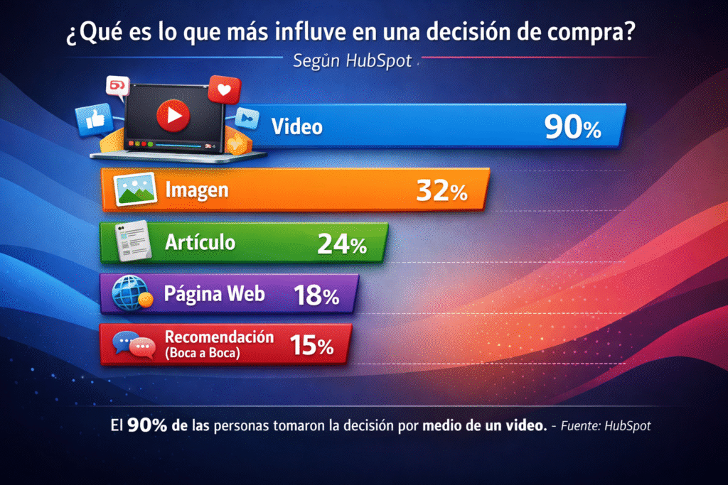 Basado en estudios de HubSpot, una de las plataformas de marketing y ventas más reconocidas a nivel mundial, el video se ha consolidado como el formato con mayor impacto en la toma de decisiones de compra. Según sus estadísticas, más del 90% de las personas afirma que un video influyó directamente en su decisión de compra, superando ampliamente a imágenes, artículos escritos, páginas web tradicionales e incluso la recomendación boca a boca.